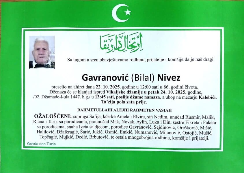 In memoriam: Nivez (Bilala) GAVRANOVIĆ(Porodici i rodbini upućujemo saučešće . Laka mu bh. zemlja Desk23. 10. 2025.In memoriam, Info (Porodici i rodbini upućujemo saučešće . Foto: PP Revda Tuzla) Post Views: 165 Podijeli