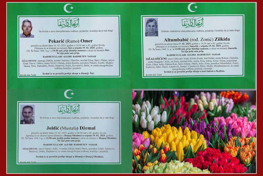 In memoriam: Omer PEKARIĆ, Zilkida ALTUMBABIĆ, Džemal JOLDIĆPreminulo je više naših sumještana i komšija. Mir dušama njihovim. Laka im bh. zemlja... Desk18. 02. 2025.In memoriam, Info (Porodicama i rodbini upućujemo iskreno saučešće. Mir dušama njihovim – Tuzlalive.ba; Foto: PP Revda Tuzla) Post Views: 503 Podijeli