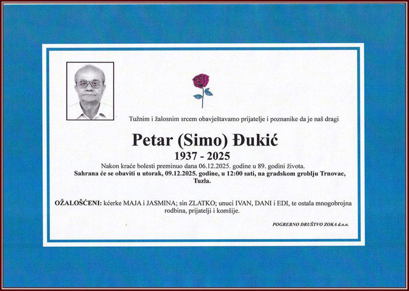 Sahrana će se obaviti u utorak, 9. decembra 2025. godine, u 12:00 sati, na Gradskom groblju Trnovac u Tuzli. Slava mu hvala. Laka mu bh. zemlja