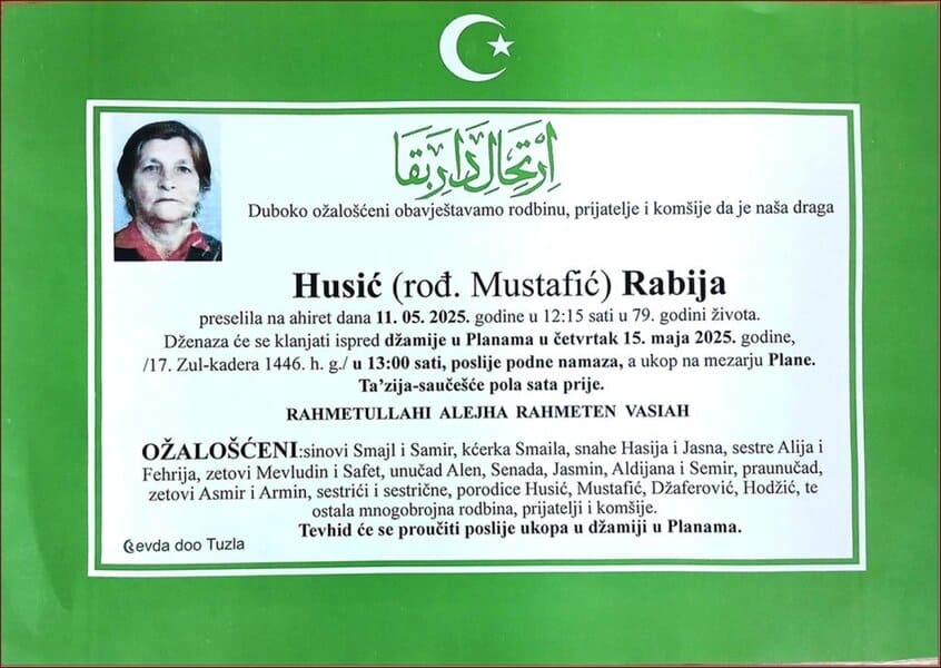In memoriam: Rabija HUSIĆ (Mustafić)Preselila je u 79. godini Rabija Husić (Mustafić). Vječni rahmet njenoj duši, a laka bh. zemlja... Desk15. 05. 2025.In memoriam, Info (Porodici, rodbini i prijateljima upućujemo iskreno saučešće – TuzlaL!VE.ba, Foto: PP Revda Tuzla) Post Views: 257 Podijeli