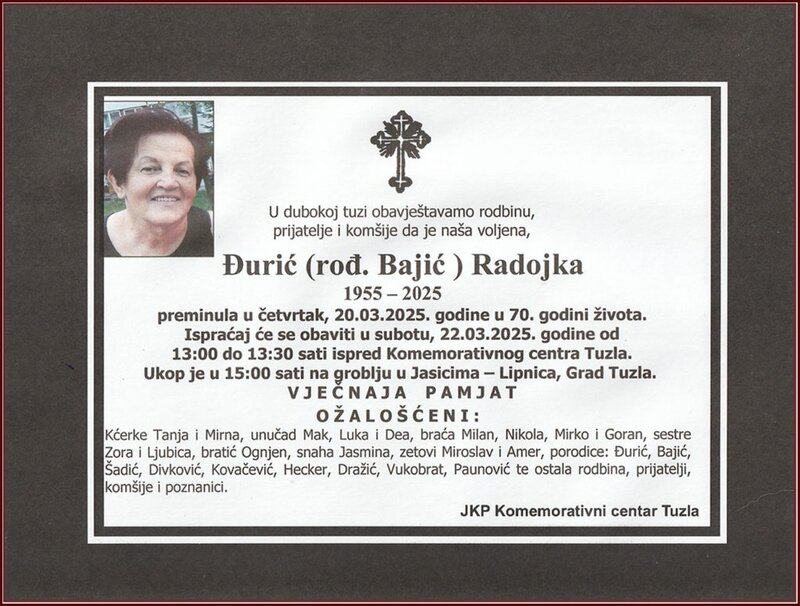 Ispraćaj će se obaviti u subotu, 22. marta 2025. godine, ispred Komemoraivnog centra u Tuzli, dok je ukop na groblju Jasici - Lipnica