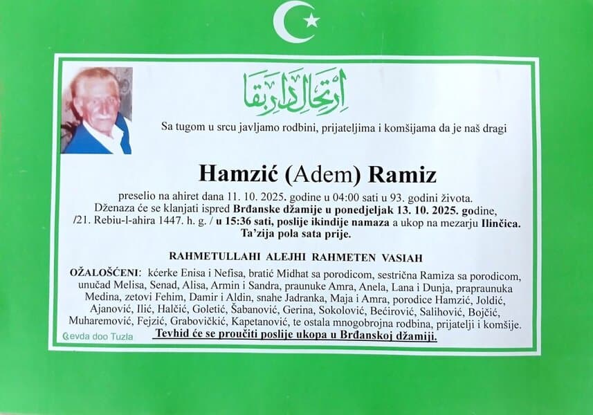 In memoriam: Ramiz (Adema) HAMZIĆDženaza će se klanjati ispred Brdžanske džamije u Tuzli, u ponedjeljak, 13. oktobra 2025. godine, u 15:36 sati, dok je ukop na mezarju Ilinčica Desk12. 10. 2025.In memoriam, Info (Porodici i rodbini iskreno saučešće, laka mu bh. zemlja – Tuzlalive.ba; Foto: PP Revda Tuzla) Post Views: 262 Podijeli