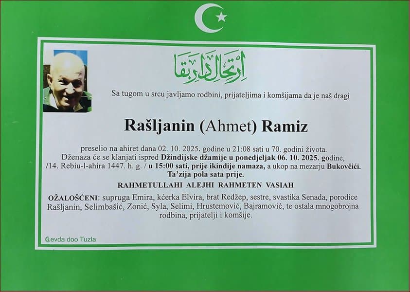 Preminuo je naš sugrađanin, prijatelj i komšija, Ramiz (Ahmeta) RAŠLJANIN. Upućujemo mu posljednji pozdrav. Porodici saučešće i sabur. Laka mu bh. zemlja