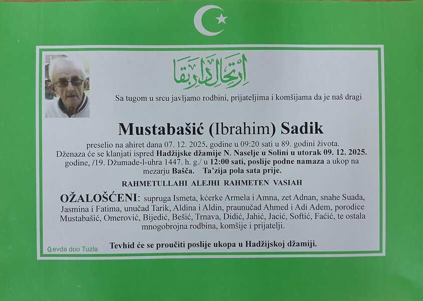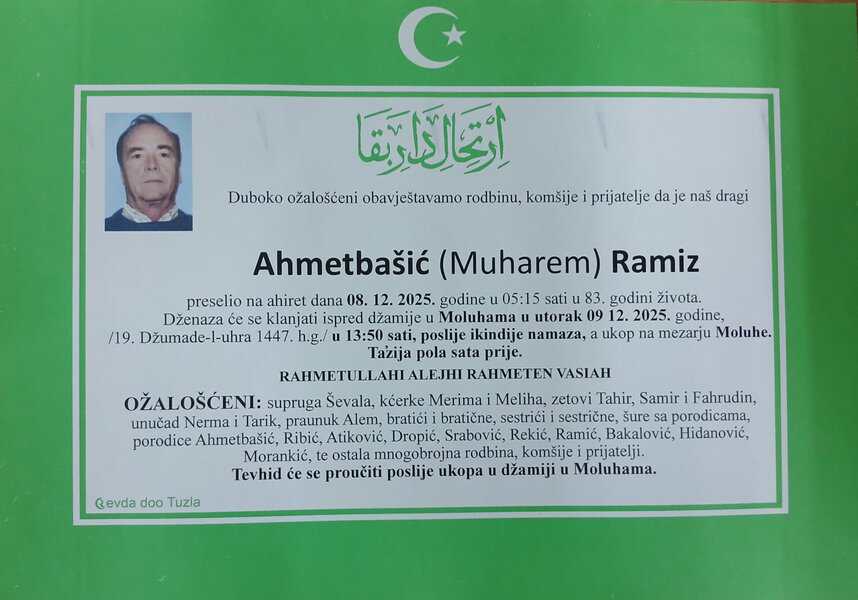 In memoriam: Ramiz (Muharema) AHMETBAŠIĆ, Sadik (Ibrahima) MUSTABAŠIĆVječni rahmet njihovim dušama. Porodicama saučešće i sabur. Laka im bh. zemlja Desk08. 12. 2025.In memoriam, Info (Porodicama i rodbini upućujemo saučešće i sabur – Tuzlalive.ba; Foto: PP Revda Tuzla) Post Views: 166 Podijeli