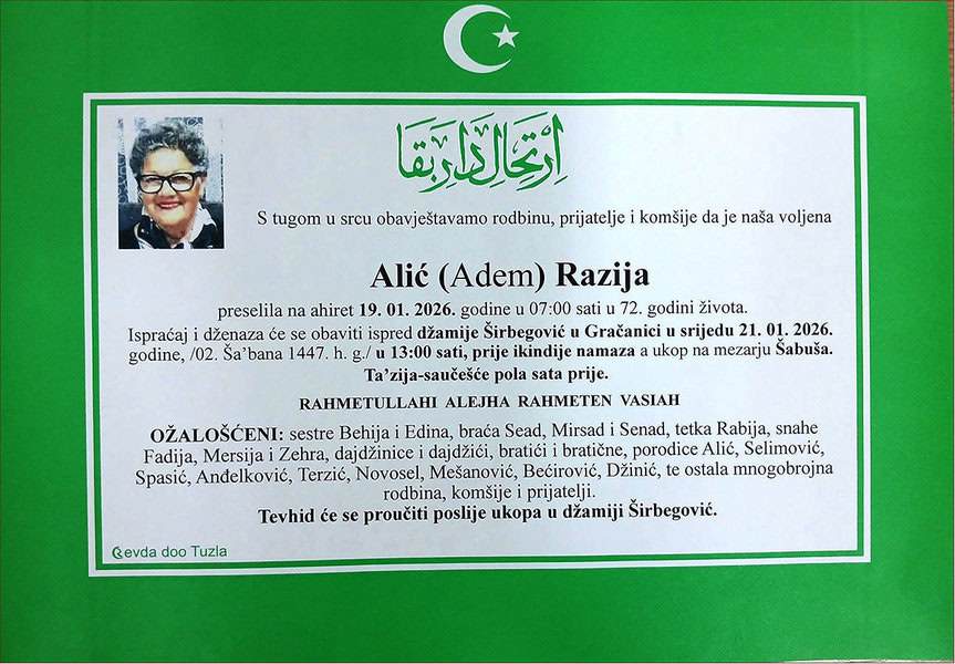 Preminula je u 72. godini Razija (Adema) ALIĆ. Upućujemo joj posljednji pozdrav. Rahmet njenoj duši, a laka bh. zemlja...