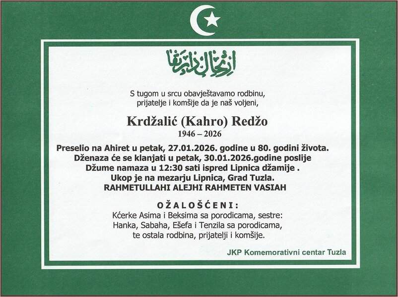 Dženaza će se klanjati u petak, 30. januara 2026. godine, ispred džamije u Lipnici, u 12:30 sati. Laka mu bh. zemlja