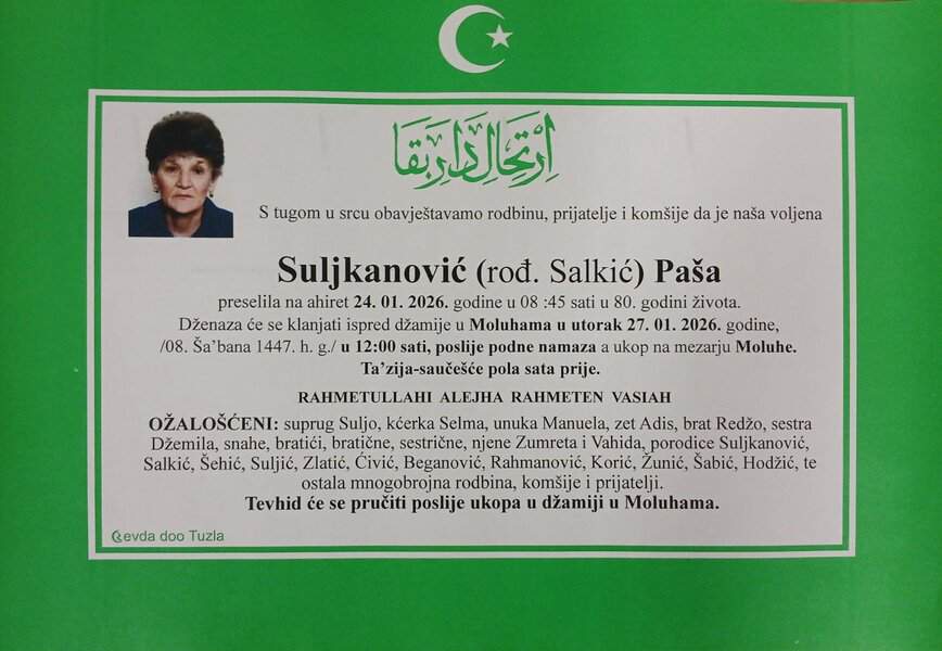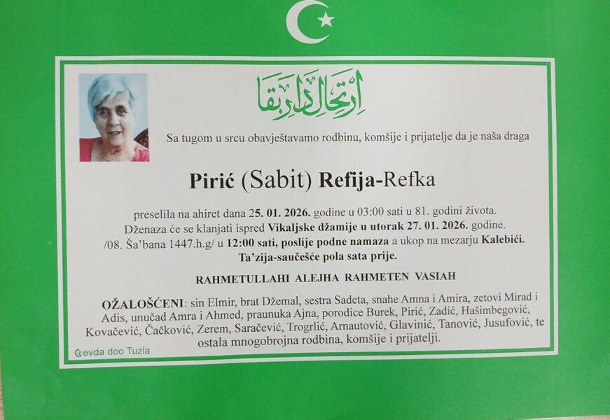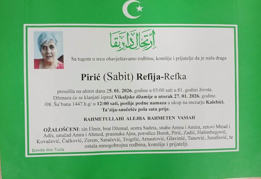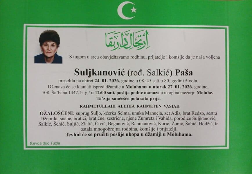 In memoriam: Refija-Refka (Sabita) PIRIĆ, Paša SULJKANOVIĆ (Salkić)Obje dženaze će se klanjati u utorak, 27. januara 2026. godine. Mir dušama njihovim. Laka im bh. zemlja Desk26. 01. 2026.In memoriam, Info (Porodicama i rodbini upućujemo saučešće i sabur – Tuzlalive.ba; Foto: PP Revda Tuzla) Post Views: 161 Podijeli