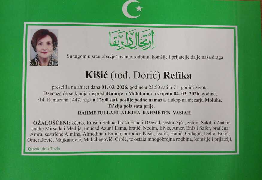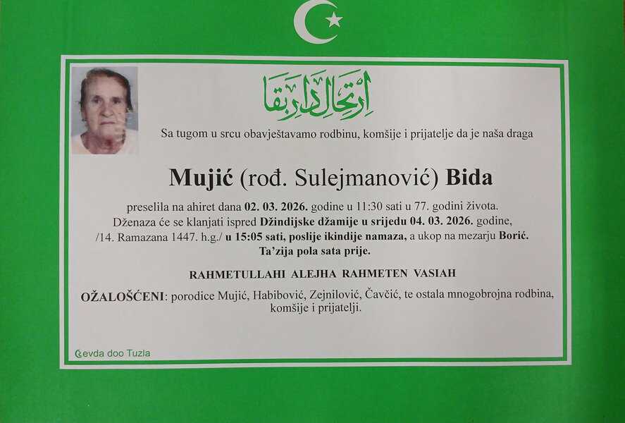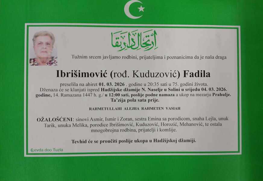 In memoriam: Refika KIŠIĆ (Dorić), Bida MUJIĆ (Sulejmanović), Fadila IBRIŠIMOVIĆ (Kuduzović)Neka im je vječni rahmet. Porodicama saučešće i sabur. Laka im bh. zemlja Desk03. 03. 2026.In memoriam, Info (Porodicama i rodbini upućujemo iskreno saučešće. Rahmet njihovim dušama – Tuzlalive.ba; Foto: PP Revda Tuzla) Post Views: 88 Podijeli