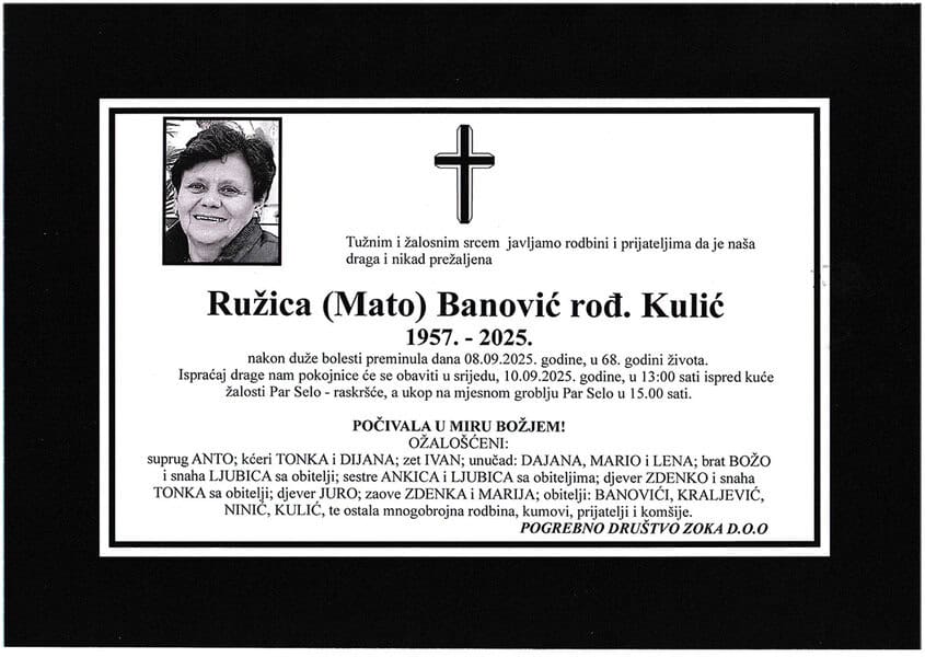 Nakon duže bolesti preminula je u 68. godini. Ispraćaj će se obaviti u srijedu, 10. septembra 2025. godine, ispred kuće žalosti u Par Selu u 15:00 sati