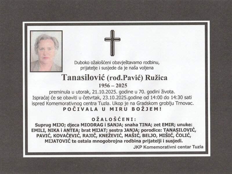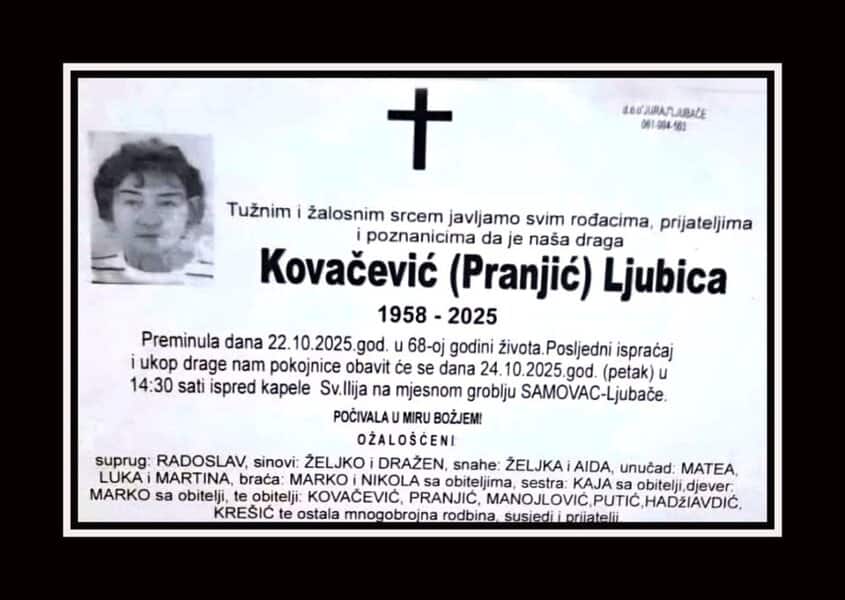In memoriam: Ružica TANASILOVIĆ (Pavić), Ljubica KOVAČEVIĆ (Pranjić)Počivale u miru Božjem. Sućut obiteljima i rodbini. Laka im bh. zemlja Desk22. 10. 2025.In memoriam, Info (Obiteljima i rodbini upućujemo iskrenu sućut. Počivale u miru Božjem – portal Tuzlalive.ba; Foto: Komemorativni centar Tuzla i PD Juraj, Ljubače) Post Views: 226 Podijeli