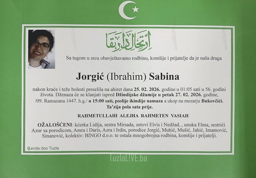 In memoriam: Sabina (Ibrahima) JORGIĆPrerano nas je, u 56. godini, napustila Sabina (Ibrahima) Jorgić. Mir duši njenoj. Porodici saučešće. Laka joj bh. zemlja Desk26. 02. 2026.In memoriam, Info (Porodici i rodbini upućujemo iskreno saučešće – portal Tuzlalive.ba; Foto: PP Revda Tuzla) Post Views: 162 Podijeli
