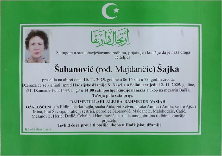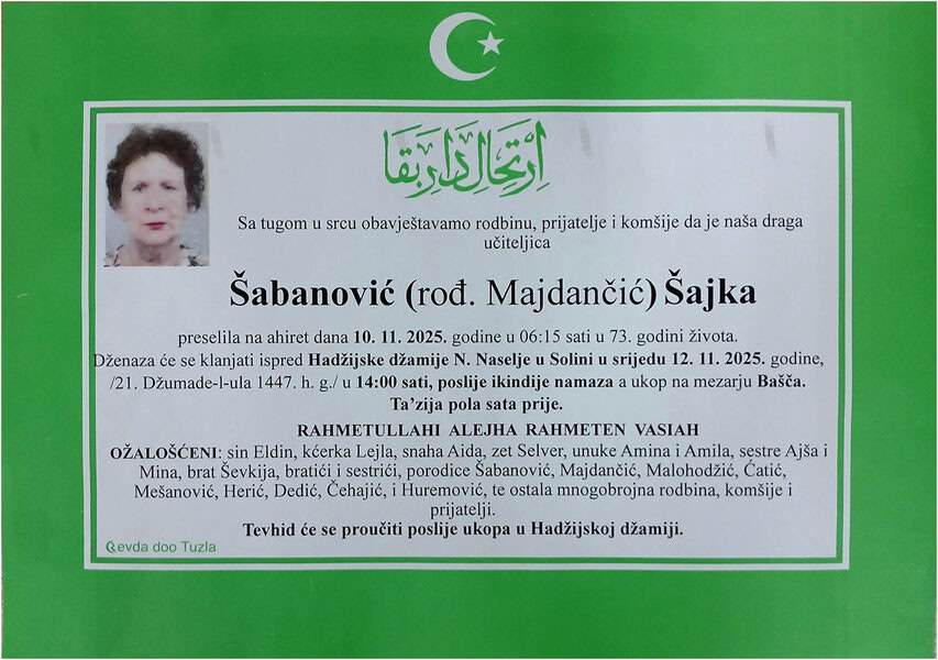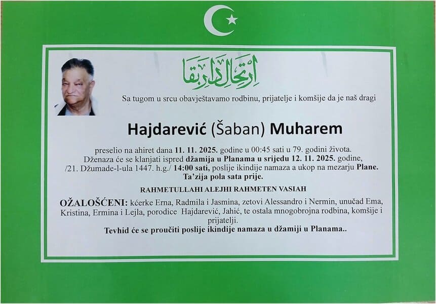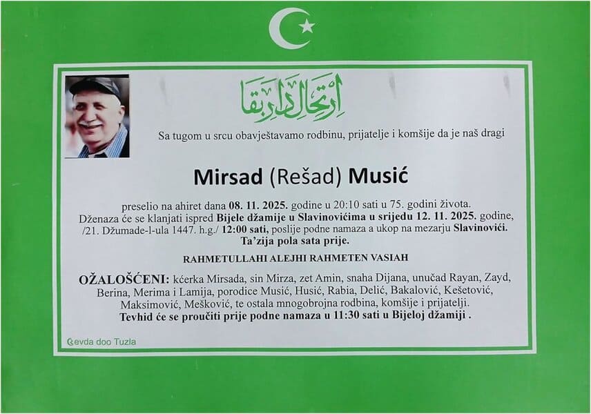 In memoriam: Šajka ŠABANOVIĆ (Majdančić), Mirsad (Rešada) MUSIĆ, Muharem (Šabana) HAJDAREVIĆ (Foto)Neka je vječni rahmet njihovim dušama. Porodicama saučešće i sabur. Laka im bh. zemlja Desk11. 11. 2025.In memoriam, Info (Porodicama i rodbini upućujemo saučešće. Mir dušama njihovim – portal Tuzlalive.ba; Foto: PP Revda Tuzla) Post Views: 194 Podijeli