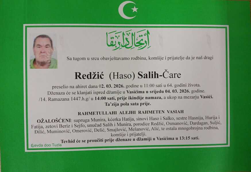 In memoriam: Salih (Hase) REDŽIĆ – ČarePreselio u 64. godini. Rahmet njegovoj duši. Porodici saučešće i sabur. Laka mu bh. zemlja Desk03. 03. 2026.In memoriam, Info (Porodici i rodbini upućujemo saučešće – Tuzlalive.ba; Foto: PP Revda Tuzla) Post Views: 69 Podijeli