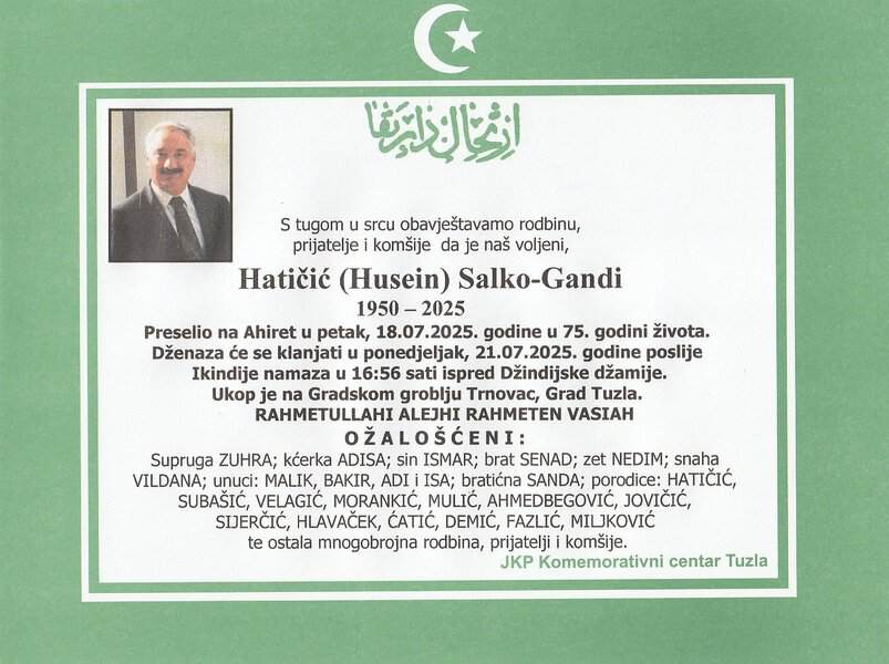 Preminuo je ugledni sugrađanin, Tuzlak, gradski šeret, ali i odan prijatelj, Salko Hatičić - Gandi. Neka mu je rahmet duši. Nedostajat će nam. Laka mu bh. zemlja...