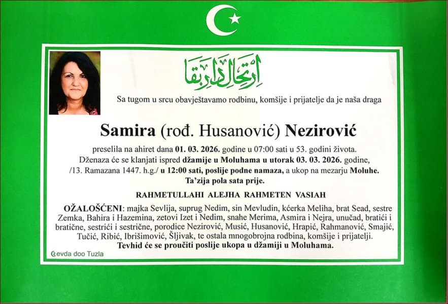 Prerano nas je, u 53. godini, napustila Samira Nezirović (Husanović). Upućujemo joj posljednji pozdrav. Mir duši njenoj. Laka joj bh. zemlja