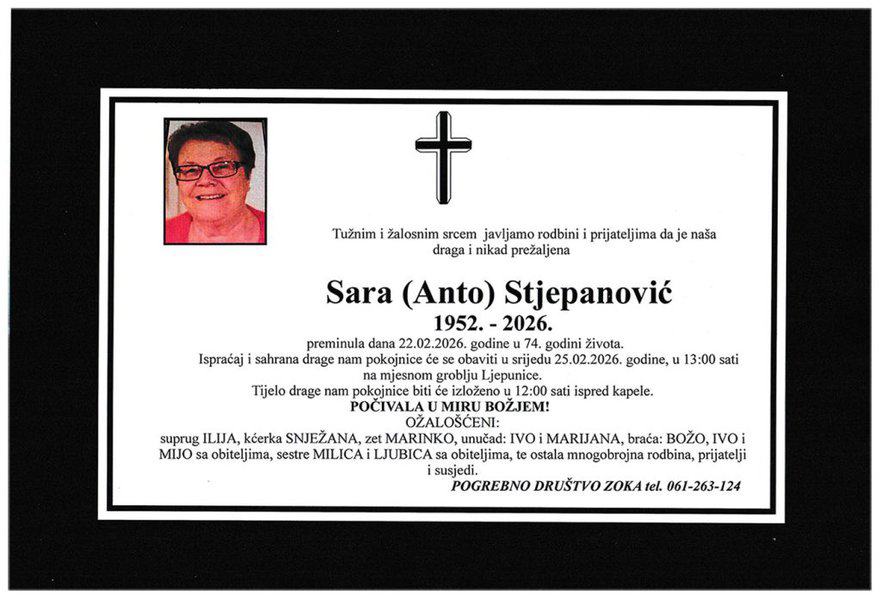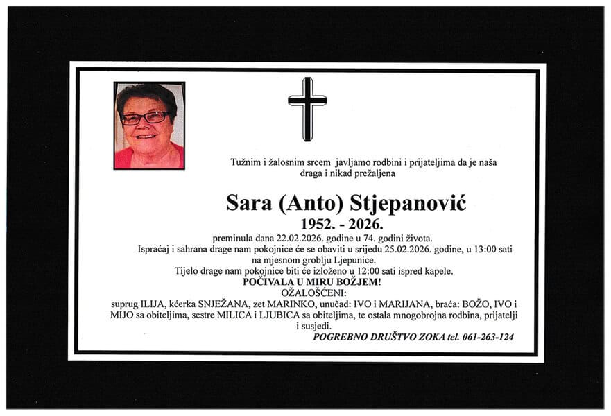 Ispraćaj i sahrana pokojnice obavit će se u srijedu, 25. februara 2026. godine, u 13:00 sati, na mjesnom groblju Ljepunice. Počivala u miru Božjem. Laka joj bh. zemlja