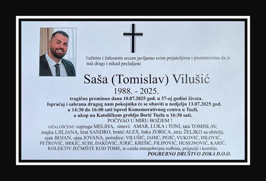 Ispraćaj i sahrana tragično preminulog Saše Vilušića obavit će se u nedjelju, 13. jula 2025. godine, ispred Komemorativnog centra Tuzla, od 14:30 do 16:00 sati, dok je ukop na Katoličkom groblju Borić