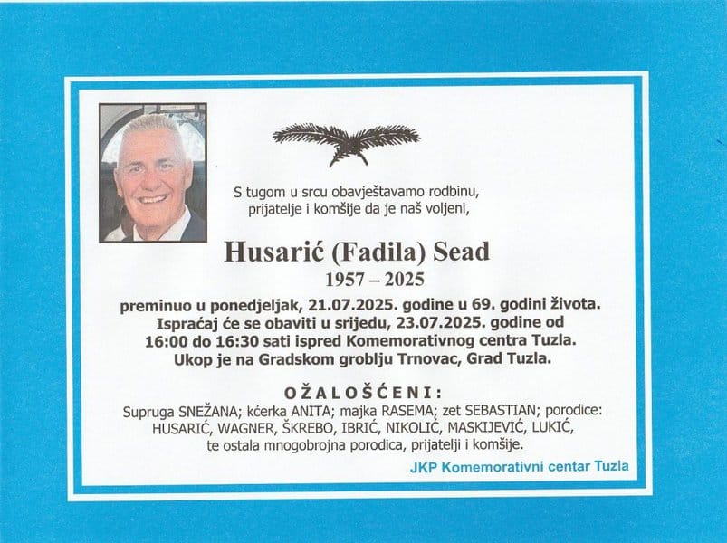 Ispraćaj će se obaviti u srijedu, 23. jula 2025. godine, ispred Komemorativnog centra u Tuzli, od 16:00 do 16:30. Ukop je na Gradskom groblju Trnovac u Tuzli