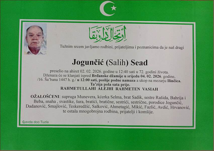 Dženaza će se klanjati ispred Brdžanske džamije u srijedu, 4. februara 2026. godine, u 12:00 sati. Ukop je na mezarju Ilinčica. Laka mu bh. zemlja