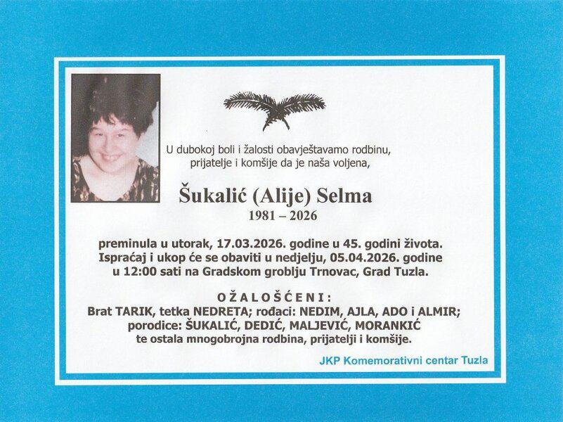 Vrlo mlada je, u 45. godini, preminula naša sugrađanka, prijateljica i komšinica, Selma (Alije) Šukalić. Upućujemo joj posljednji pozdrav. Slava joj i hvala. Laka joj bh. zemlja