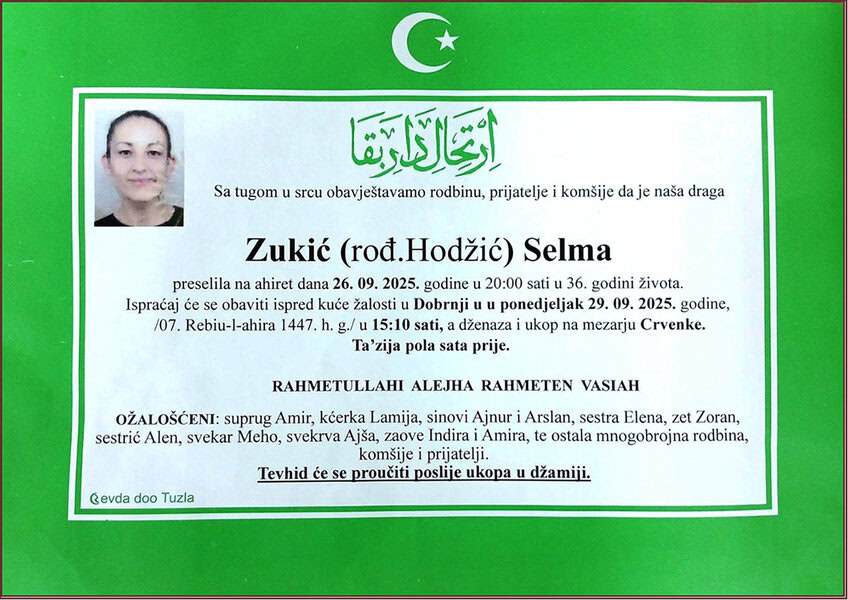 Premlada je, u 36. godini, preminula naša sumještanka, komšinica i prijateljica, Selma ZUKIĆ (Hodžić). Upućujemo joj posljednji pozdrav. Mir duši njenoj. Laka joj bh. zemlja