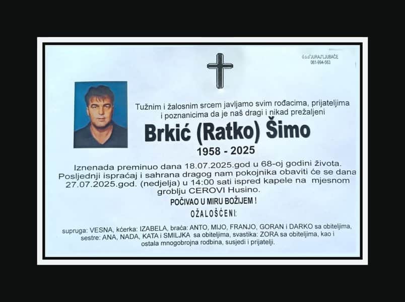In memoriam: Šimo (Ratka) BRKIĆIznenada je preminuo u 68. godini Šimo (Ratka) BRKIĆ. Počivao u miru Božjem. Laka mu bh. zemlja... Desk26. 07. 2025.In memoriam, Info (Obiteljii rodbini izražavamo iskenu sućut – portal Tuzlalive.ba; Foto: Juraj, Ljubače) Post Views: 293 Podijeli