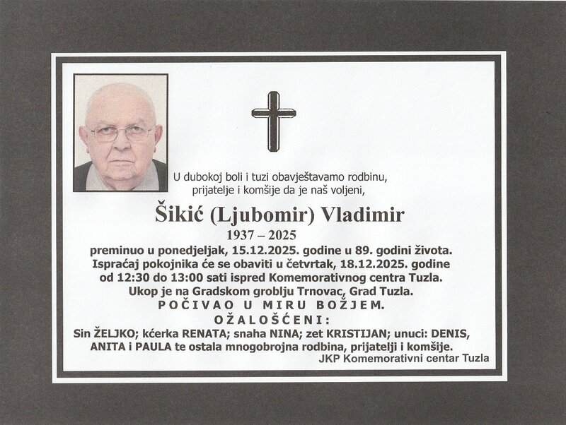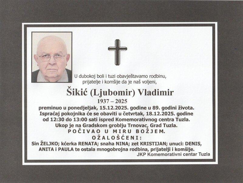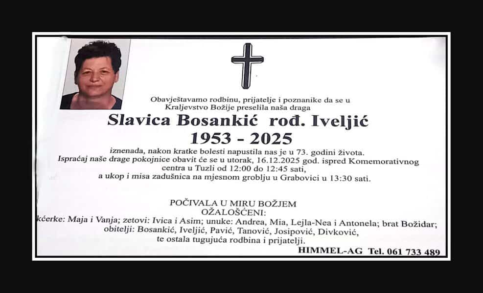 In memoriam: Slavica BOSANKIĆ (Iveljić), Vladimir (Ljubomira) ŠIKIĆIskrena sućut obitelji i rodbini. Počivali u miru Božjem. Laka im bh. zemlja... Desk16. 12. 2025.In memoriam, Info (Obiteljima i rodbini upućujemo iskrenu sućut. Počivali u miru Božjem – portal TuzlaLIVE.ba; Foto: Himmel AG i Komemorativni centar Tuzla) Post Views: 106 Podijeli