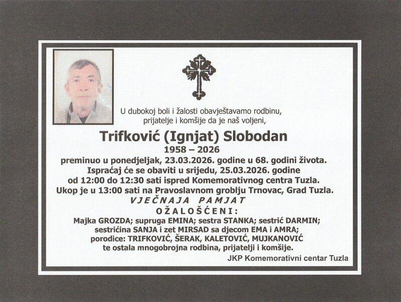Ispraćaj će se obaviti u srijedu, 25. marta 2026. godine, ispred Komemorativnog centra u Tuzli, od 12:00 do 12:3o sati. Ukop je u 13:00 sati na Pravoslavnom groblju Trnovac