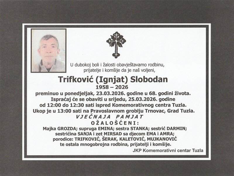 Ispraćaj će se obaviti u srijedu, 25. marta 2026. godine, ispred Komemorativnog centra u Tuzli, od 12:00 do 12:3o sati. Ukop je u 13:00 sati na Pravoslavnom groblju Trnovac