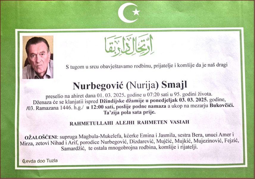 Preminuo je ugledni sugrađanin, prijatelj i dobar komšija, Smajl (Nurije) Nurbegović. Upućujemo mu posljednji pozdrav. Neka mu je vječni rahmet duši. Laka mu bh. zemlja. Porodici sabur...