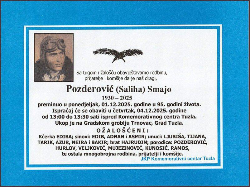 Ispraćaj će se obaviti u četvrtak, 4. decembra 2025. godine, od 13:00 do 13:30 sati, isdpred Komemorativnog centra Tuzla. Ukop je na Gradskom groblju Trnovac u Tuzli