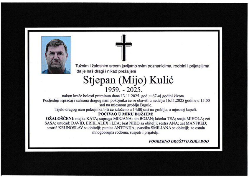 In memoriam: Stjepan (Mije) KULIĆIspraćaj će se obaviti u nedjelju, 16. novembra 2025. godine, u 15:00 sati, na mjesnom groblju Brgule Desk14. 11. 2025.In memoriam, Info (Iskrena sućut obitelji, rodbini i prijateljima – TuzlaLIVE.ba, Foto: PD ZOKA Tuzla) Post Views: 183 Podijeli