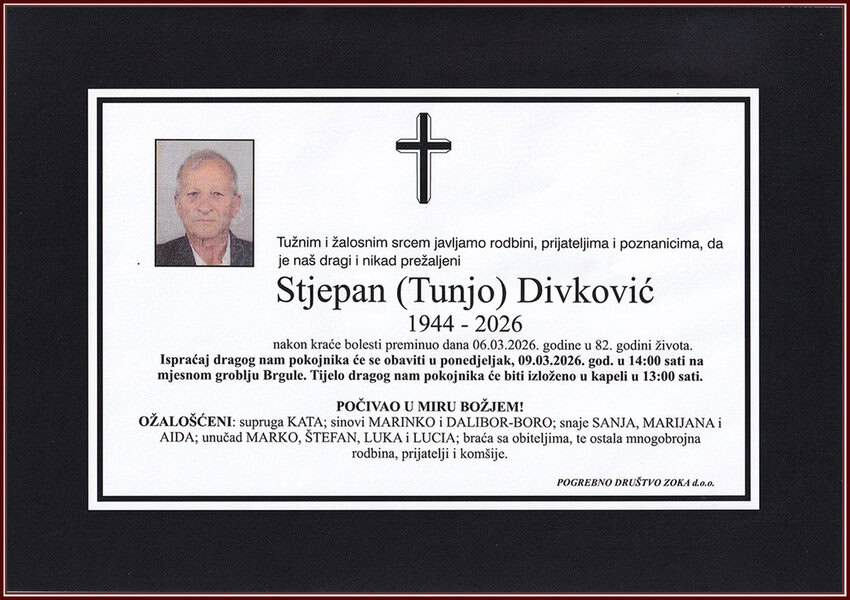 Ispraćaj pokojnika obavit će se u ponedjeljak, 9. marta 2026. godine, u 14:00 sati, na mjesnom groblju Brgule. Počivao u miru Božjem. Laka mu bh. zemlja