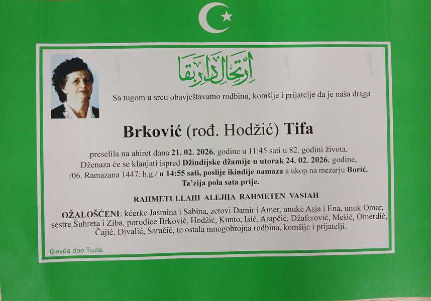 In memoriam: Tifa BRKOVIĆ (Hodžić)Dženaza će se klanjati ispred Džindijske džamije u Tuzli, u utorak, 24. februara 2026. godine, u 14:55 sati. Ukop je na mezarju Borić. Laka joj bh. zemlja Desk23. 02. 2026.In memoriam, Info (Iskreno saučešće porodici i rodbini. Mir duši njenoj – TuzlaLIVE.ba; Foto: PP Revda Tuzla) Post Views: 240 Podijeli