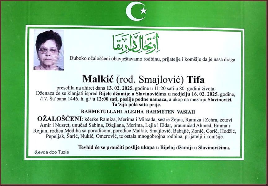 In memoriam: Tifa MALKIĆ (Smajlović)Dženaza će se klanjati ispred Bijele džamije u Slavinovićima. u nedjelju, 16. februara 2025. godine... Desk14. 02. 2025.In memoriam, Info (Porodici i rodbini iskreno saučešće. Mir duši njenoj .- Tuzlalive.ba; Foto: PP Revda Tuzla) Post Views: 297 Podijeli