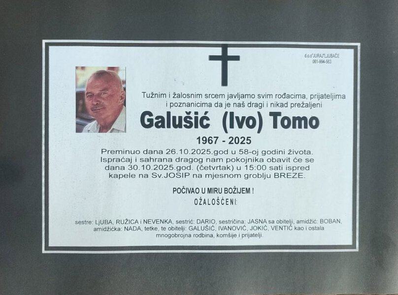 Ispraćaj i sahrana obavit će se u u četvrtak, 30. oktobra 2025. godine, u 15 sati, ispred kapele na mjesnom groblju Breze