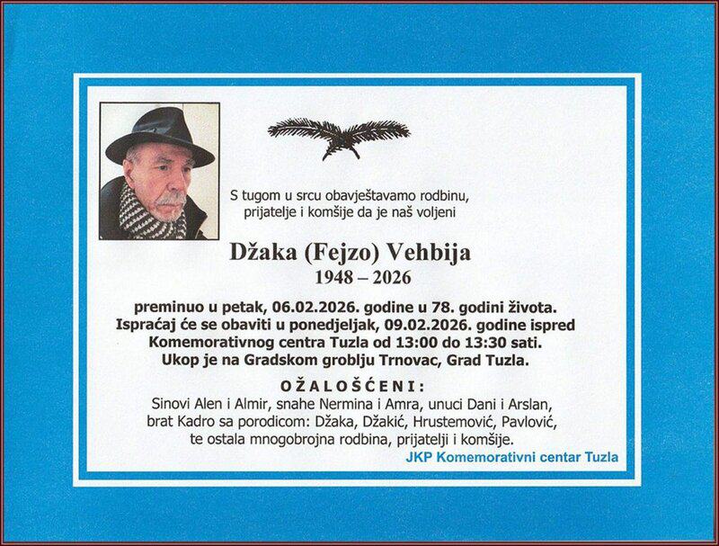 Ispraćaj će se obaviti u ponedjeljak, 9. februara 2026. godine, ispred Komemorativnog centra Tuzla, u vremenu od 13:00 do 13:30 sati. Ukop je na Gradskom groblju Trnovac, Grad Tuzla. Laka mu bh. zemlja