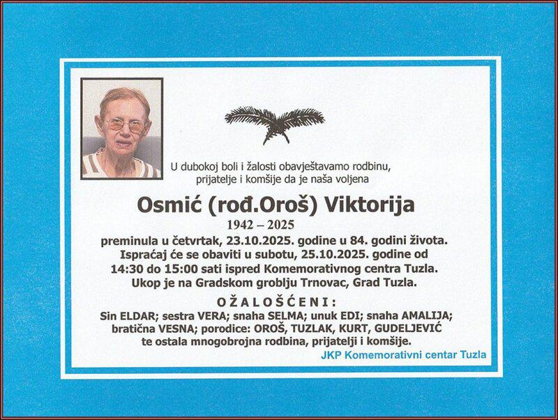 Preminula je naša sugrađanka, prijateljica i komšinica, VIKTORIJA OSMIĆ (OROŠ). Upućujemo joj posljednji pozdrav. Mir duši njenoj. Slava joj i hvala. Laka joj bh. zemlja