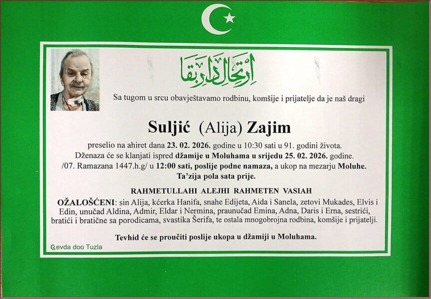 Dženaza će se klanjati ispred džamije u Moluhama, u srijedu, 25. februara 2026. godine, u 12:00 sati. Mir duši njegovoj. Laka mu bh. zemlja