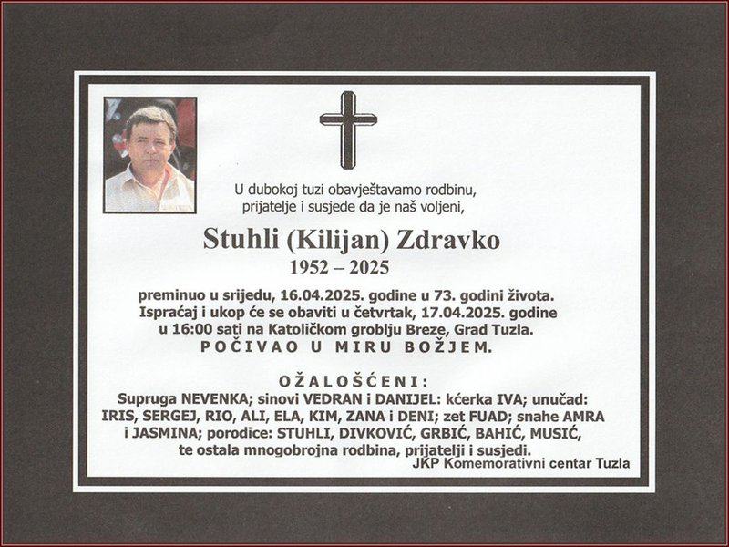 Napustio nas je sugrađanin, prijatelj i kompšija, Zdravko (Kilijana) Stuhli. Počivao u miru Božjem. Laka mu bh. zemlja
