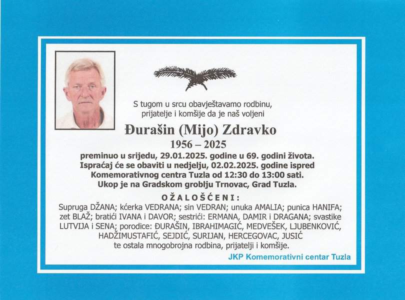 Napustio nas je sugrađanin, prijatelj, komšija, saradnik, profesor u penziji, Zdravko (Mije) Đurašin. Upućujemo mu posljednji pozdrav. Slava mu i hvala. Laka mu bh. zemlja...