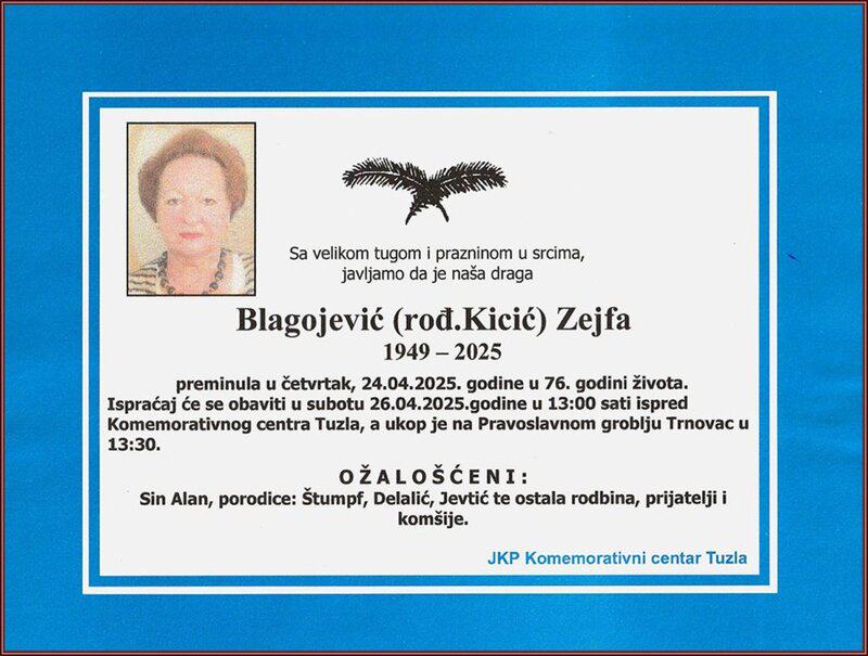 Napustila nas je sugrađanka, prijateljica i komšinica, Zejfa Blagojević (Kicić). Upućujemo joj posljednji pozdrav. Laka joj bh. zemlja. Slava joj i hvala...