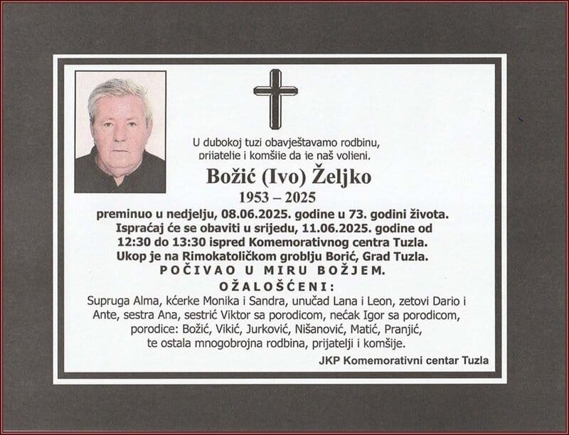 Ispraćaj će se obaviti u srijedu, 11. juna 2025. godine, ispred Komemorativnog centra u Tuzli, od 12:30 do 13:30. Ukop je na Rimokatoličkom groblju Borić u Tuzli. Počivao u miru Božjem!