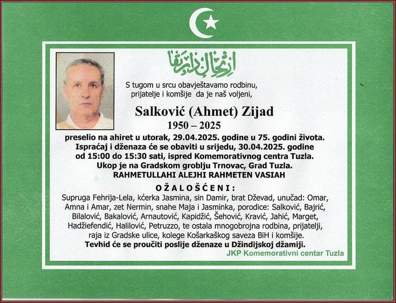 Preminuo je naš sugrađanin, dobar čovjek, sportski radnik, košarkaši sudija, prijatelj, komšija, Zijad - Zijo Salković. Upućujemo mu posljednji pozdrav. Neka je rahmet njegovoj duši, a laka zemlja bosanska. Saučešće porodici i rodbini...