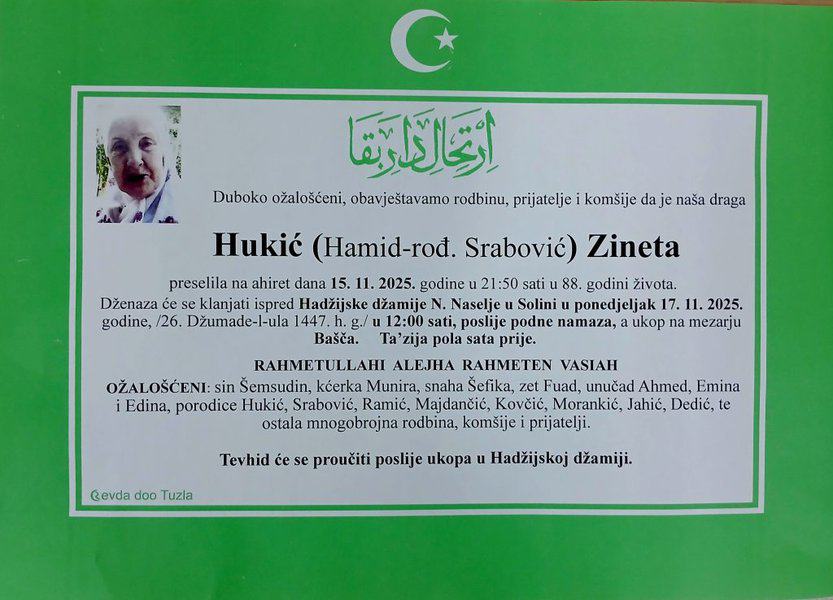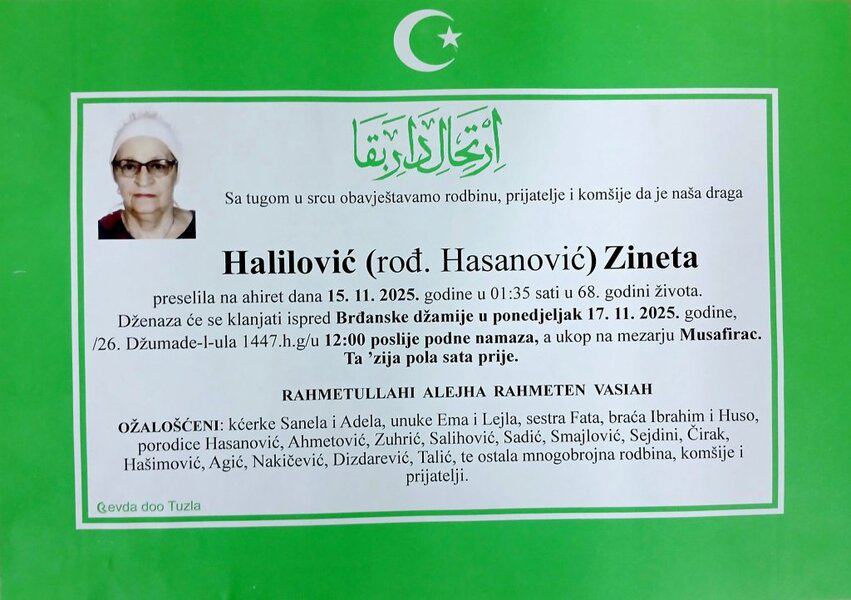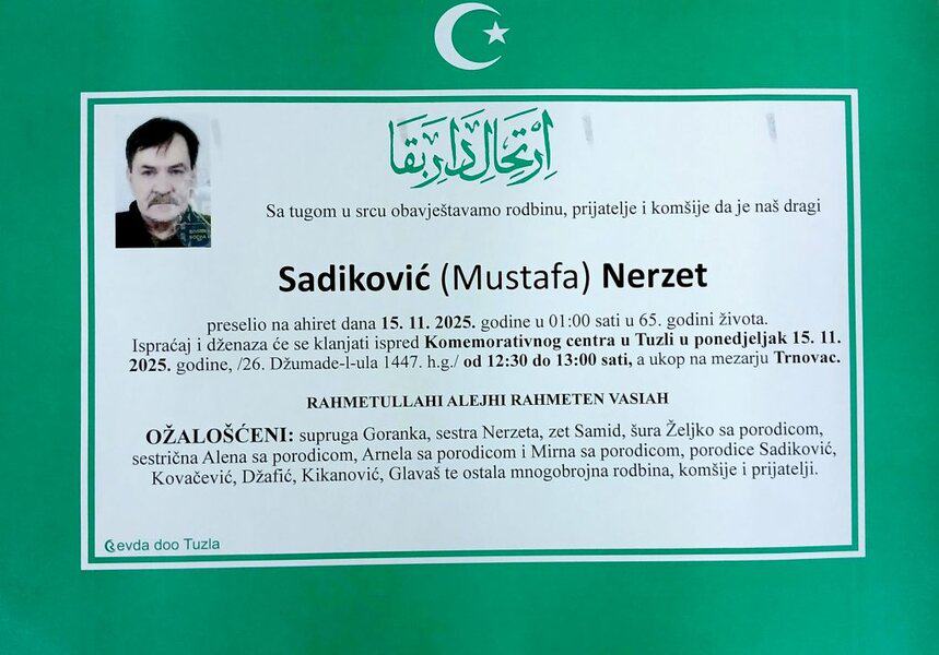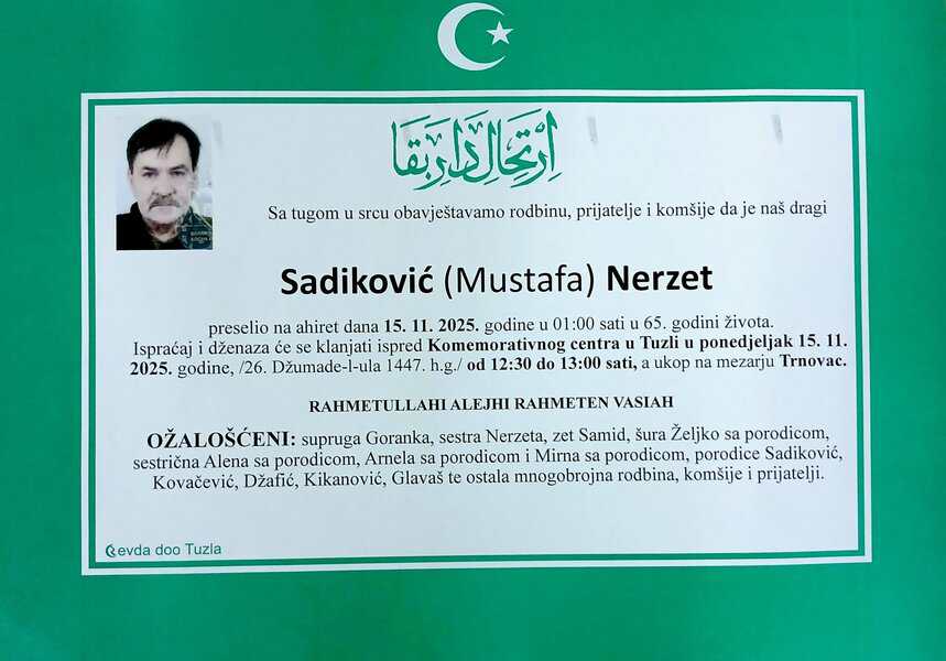 In memoriam: Zineta HALILOVIĆ, Nerzet SADIKOVIĆ, Zineta HUKIĆ (Foto)Neka je vječni rahmet njihovim dušama. Porodicama saučešće i sabur. Laka im bh. zemlja... Desk16. 11. 2025.In memoriam, Info (Porodicama i rodbini upućujemo iskreno saučešće – portal Tuzlalive.ba; Foto: PP Revda Tuzla) Post Views: 146 Podijeli