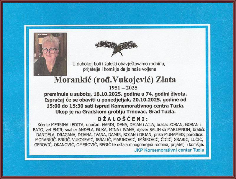 Napustila nas je u 74. godini sugrađanka, prijateljica i komšinica, Zlata MORANKIĆ (Vukojević). Upućujemo joj posljednji pozdrav. Neka joj je vječna slava i hvala. Laka joj bh. zemlja