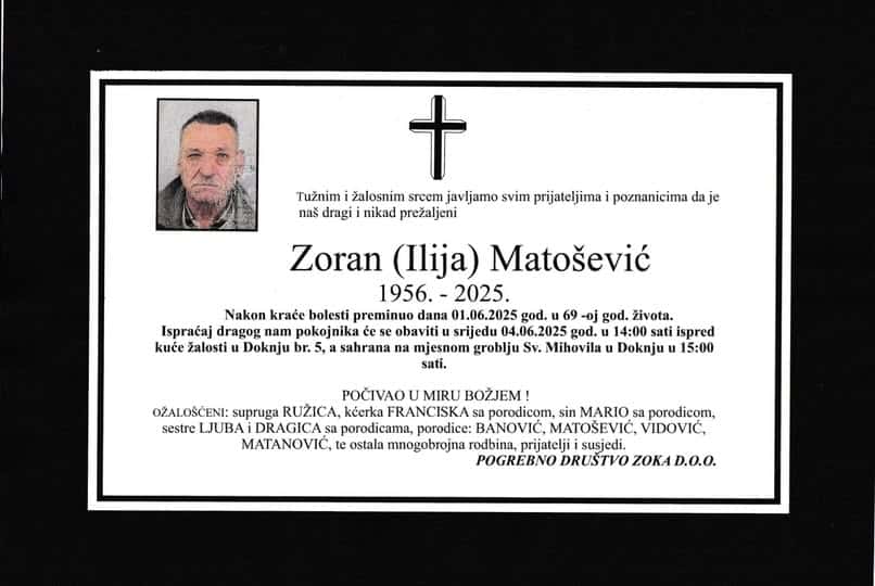 In memoriam: Zoran (Ilije) MATOŠEVIĆIspraćaj će se obaviti u srijedu, 4. juna 2025. godine u 14 sati, ispred kuće žalosti u Doknju Desk03. 06. 2025.In memoriam, Info (Porodici i rodbini upućujemo iskreno saučešće – portal Tuzlalive.ba; Foto: PD Zoka doo, Tuzla) Post Views: 195 Podijeli