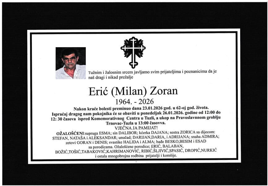 Prerano nas je, u 62. godini, napustio sugrađanin, komšija i prijatelj, Zoran (Milana) ERIĆ. Upućujemo mu posljednji pozdrav. Počivao u miru Božjem. Laka mu bh. zemlja