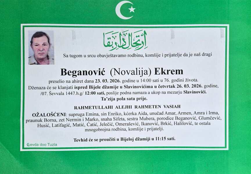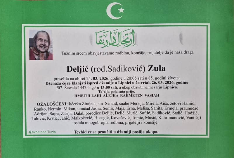 In memoriam: Zula DELJIĆ (Sadiković); Ekrem (Novalije) BEGANOVIĆNeka je vječni rahmet njihovim dušama. Porodicama saučešće i sabur. Laka im bh. zemlja Desk25. 03. 2026.In memoriam, Info (Porodicama i rodbini upućujemo saučešće. Mir dušama njihovim – portal Tuzlalive.ba; Foto: PP Revda Tuzla) Post Views: 92 Podijeli