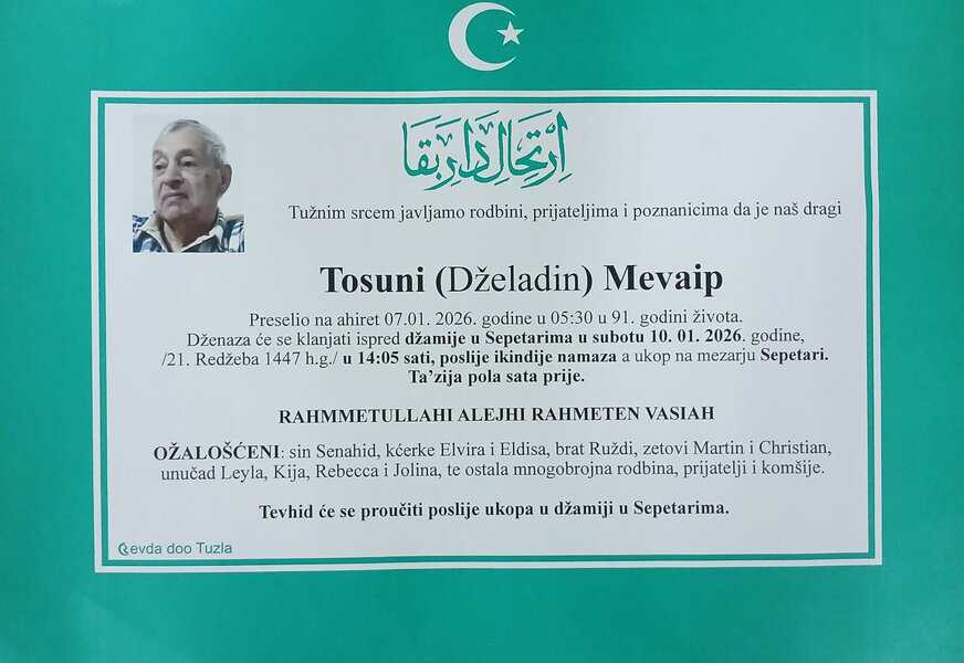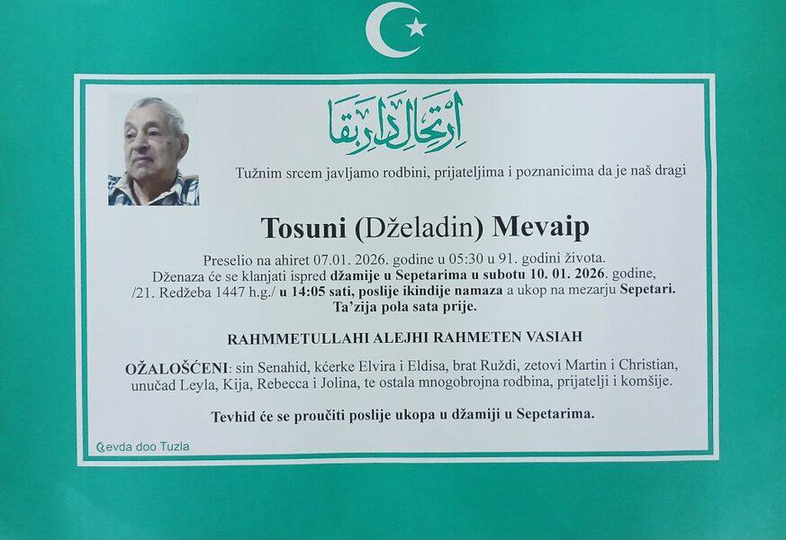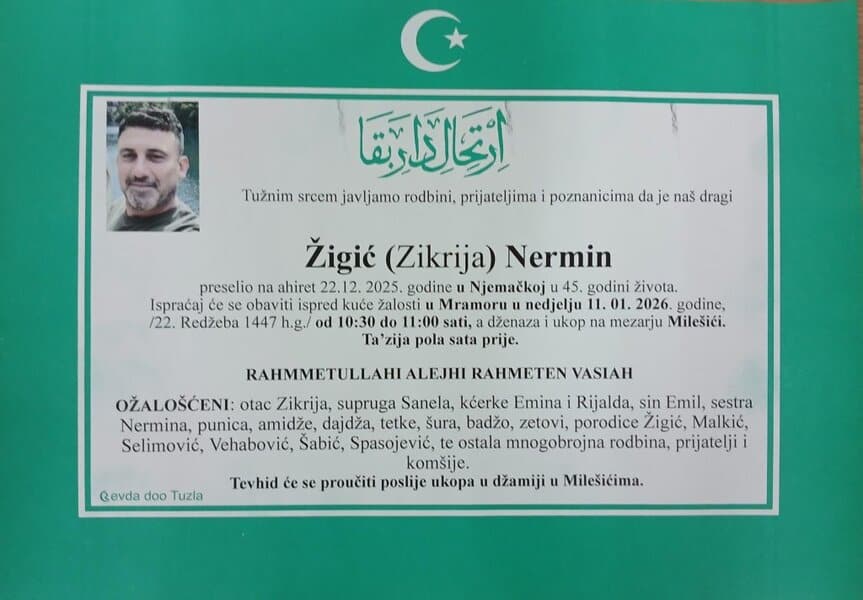 In memoriam: Zulfa MUSTAFIĆ, Mehmedalija KAVAZOVIĆ, Mevaip TOSUNI, Nermin ŽIGIĆVječni rahmet njihovim plemenitim dušama. Porodicama saučešće i sabur. Laka im bh. zemlja Desk09. 01. 2026.In memoriam, Info (Porodicama i rodbini upućujemo saučešće – Tuzlalive.ba; Foto: Komemorativni centar i PP Revda Tuzla)i sabur Post Views: 140 Podijeli